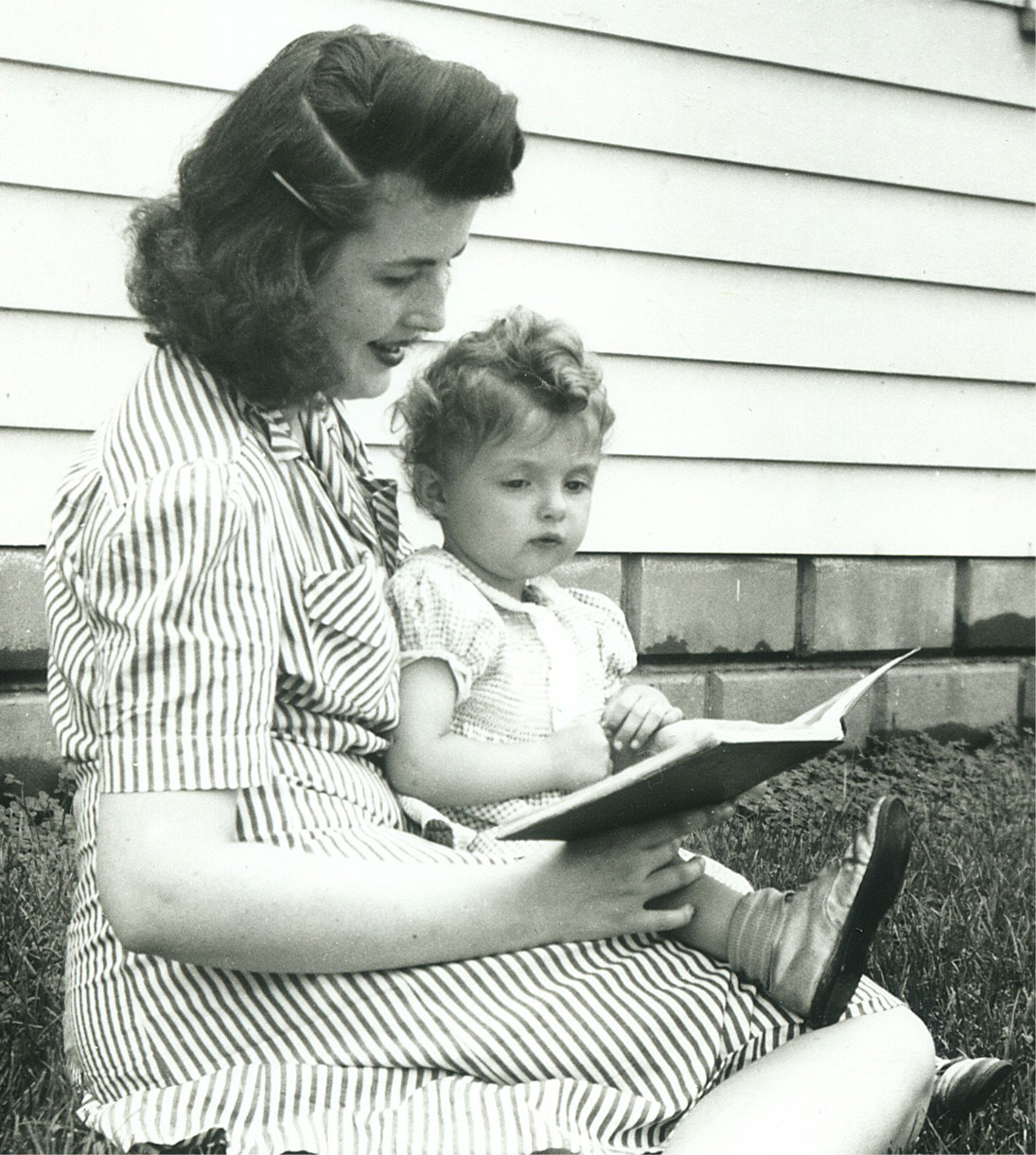 My home office is full of photos, including many of Mother. My favorite was taken in 1998 at Mother’s retirement party. This picture is on my desk and shows Mother, Peggy, Louise and me each reading a Mary Higgins Clark book and sitting on our cars with their license plates, LIBRARY (Mother’s) and READ (mine). Another photo is of me, probably age two, sitting on Mother’s lap while we read a book together.