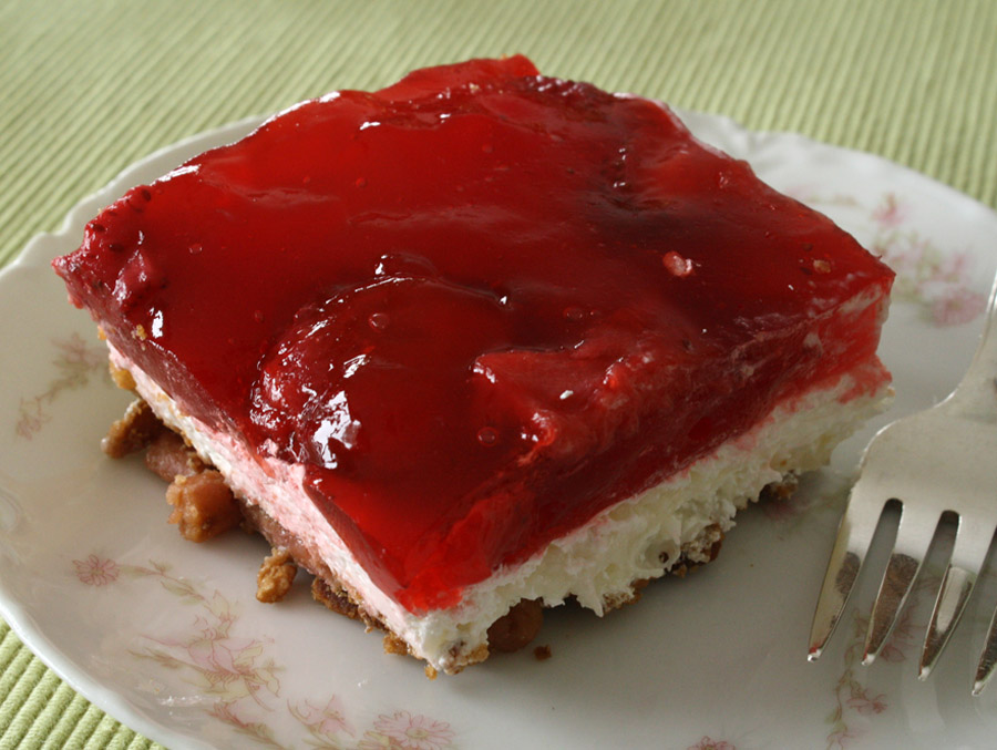 * Even though the recipe says that my Jell-O mixture never gets partially set before I put it in the fridge, that is not true in this case. When I made the salad in the photograph, I accidentally left the Jell-O in the saucepan for about an hour before pouring it into the 9″x13″ pan. By that time, the Jell-O had definitely set making it look sort of humpy in this photo.