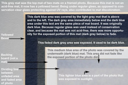 The following photo is of two mats and the corner of a picture. They were framed together in the ’90s, but are pulled apart in this photo to illustrate the fading effects from not using acid-free mats and not using conservation clear glass. Admittedly, the text on the photo takes some muddling through.