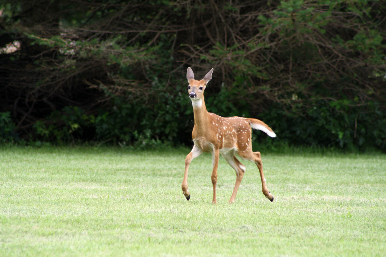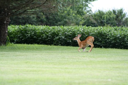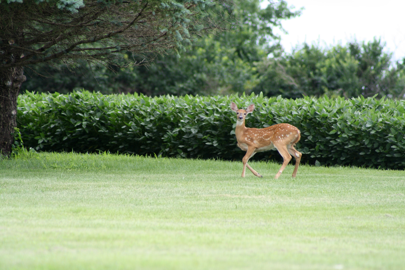 Most mornings this summer Bill has seen a fawn and its mother come up the ravine past our house, move across the lot to the south, and disappear into the soybean field to the southwest of our house. I wonder if this fawn is the same that Bill has pointed out to me so many of those mornings.