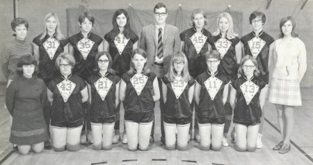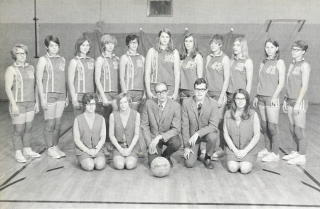 1971-72 Rolfe girls' varsity basketball team. Front row L to R: Michele Pomerenke (Piprude), Jr.; Joyce Baade (Coburn), Sr.; Louise Gunderson (Shimon), Jr.; Carol Wiegert (Franken), Sr.; Karen Brinkman (Vinson), Sr.; Julie Brinkman (Mintz), So. Back row: Head Coach Al Van Houten; Jean Brinkman (Longnecker), Jr.; Lynn Robinson, Jr.; Linda Pedersen (Tutt), Jr.; Lynn Neugent (Debel), So.; Connie Henderson (Boyd), So.; Becky Smith (Mcmullin), So.; Jeanell Winkleblack (Piconi), So.; Assistant Coach Dennis Duerling. (Click on photo to enlarge.)