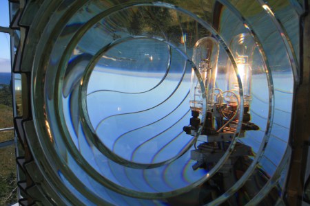 The light assembly (inside the lens) is stationary. That huge lens rotates every 160 seconds. There are 8 panels to the lens, so, from any vantage point, every 20 seconds a lens panel will align (i.e., with the viewer’s line of sight) allowing a beam of light to pass through. You can see the once-every-20 seconds visible illumination in the photo immediately above. If you click on the photo to enlarge it, you can also see three of the eight vertical panels.