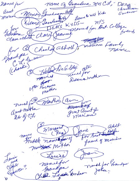 This image is of my dad's handwriting. At the top he wrote his and Mother's namesakes, followed in age order by Clara's (the oldest daughter) through mine (the youngest of the six living children*). (Click on the image to magnify it.)
