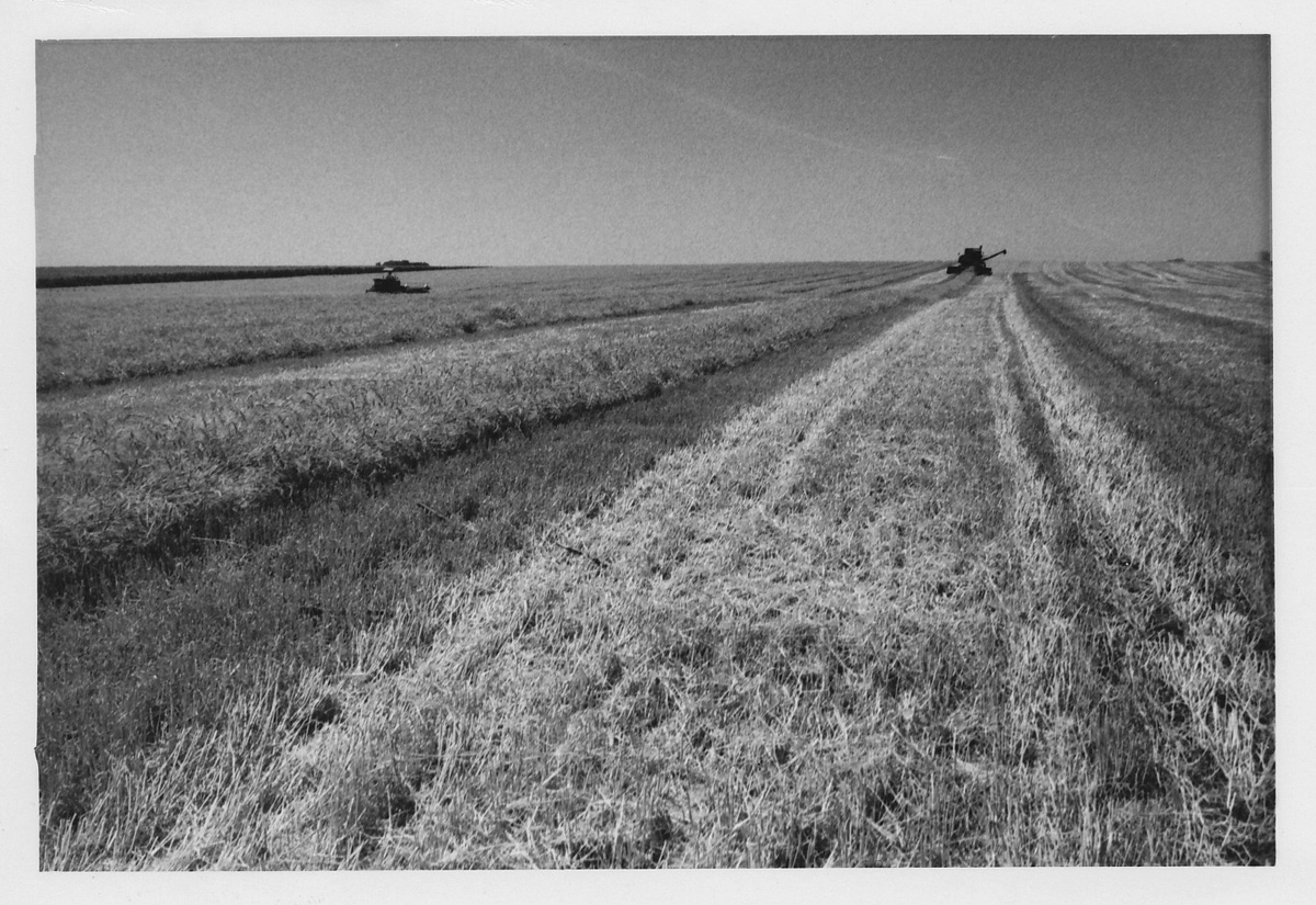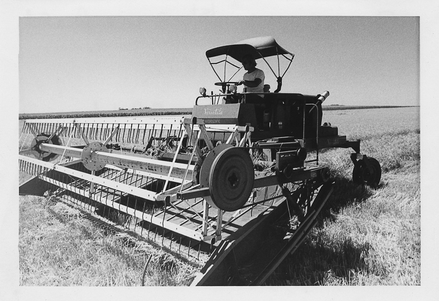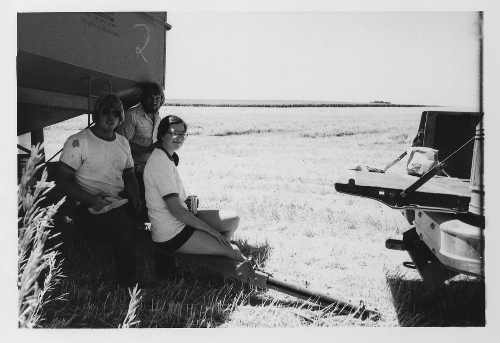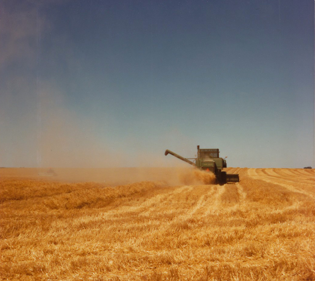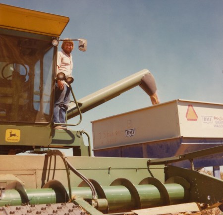 Bill's second-to-the-youngest brother Tom is pictured. As is still the norm, the moving combine dumped the grain into the also-moving wagons, i.e., on-the-go.