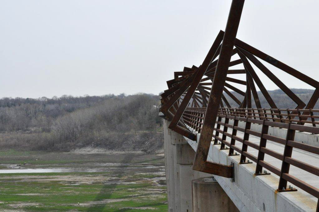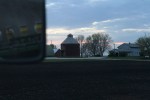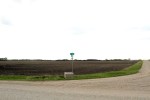 - Looking south in the same Section 13 field as the previous photos, the tractor/field cultivator are soon to appear on the horizon. Visible at left are corrugated edges of two grain bins. In the distance, near Palmer, Iowa, the red lights are located at the tops of windmills — 11 miles away.