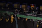 - Late at night the moisture made it so dirt started to pack on the field cultivator transport wheels (at center of this photo), making the wheels unevenly shaped. The residue in this photo is stubble from last year’s soybean crop.