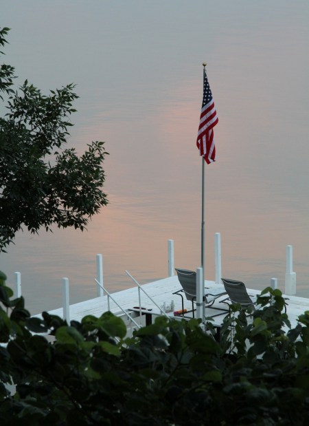 This view is across the northern part of Browns Bay, part of Iowa’s West Lake Okoboji. A map of the bay in relation to the entire lake is here. The wind turbines are actually on the west side of Emersons Bay, also shown on the map.