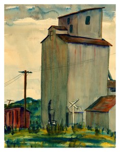 What really made me “see” Mother smile was something Kathleen said about the ag-related prints/originals, for example of the Rolfe, Iowa, grain elevator that was destroyed in a 1969 fire. Or the Iowa State University heating plant** (that Mother painted a watercolor of in 1951) that no longer exists. Kathleen kept commenting about how even though the watercolors were painted decades ago, they haven’t faded out of style. She said, “They aren’t stylized. They are sophisticated. They are contemporary portrayals of something in America we’re losing.”