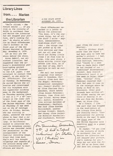 Rolfe Arrow article written by Mother (Marion Gunderson) about the project