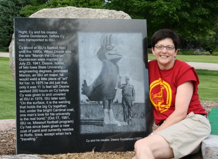 On my t-shirt is an image of my dad's Cy statue...the same as the statue on the plaque. (Click on photo to enlarge plaque text.)